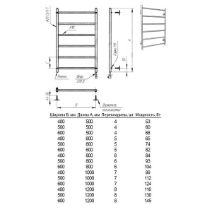 Электрический полотенцесушитель изготовлен из высококачественной нержавеющей пищевой стали. Шнур подключения и кнопка располагаются справа, под заказ можно сделать слева. Полностью соответствует требованиям нормативных договоров (ГОСТ 5632-72 п.2.1. Сан ПиН 42-123-4240-86), технических условий, разработанных предприятием-изготовителем и допущен к производству, поставке, реализации и использованию на территории РФ и стран СНГ. Технические условия работы полотенцесушителя: Мощность нагревательных элементов в зависимости от модели, марки изделия и габаритов изделия составляет 23 — 300 Вт. Номинальное напряжение питания — 230 В. Масса нагрузки на полотенцесушитель — не более 5 кг. Температура наружной поверхности полотенцесушителя в рабочем режиме (при температуре окружающего воздуха 20°С и при номинальном напряжении): t=56°С ± 10%. Допускаемое отклонение мощности: ± 10% Класс защиты от поражения электрическим током – IР 44. Чистота обработки поверхности – 10 кл. Комплектация: полотенцесушитель, 4 крепления, паспорт, коробка.